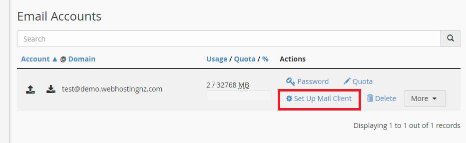 3) To the right of the email you want to setup on your device, click the 'Set Up Mail Client' link.