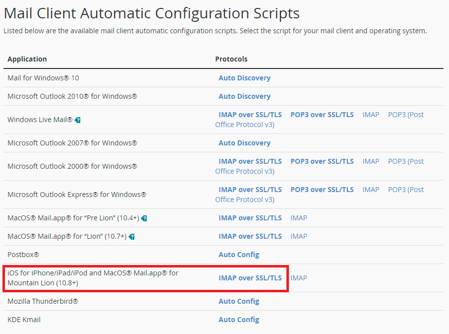 4) Scroll down until you see the iOS for iPhone/iPad/iPod line and click the 'IMAP over SSL/TLS'. This should configure your device for your mail account.
