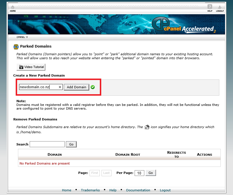 3) Put the domain name you wish to park on your account in the field and click Add Domain. Your domain should now be parked on your account.