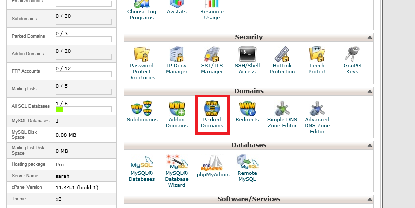 2) Log into your cPanel Control Panel, then click the Parked Domains icon as shown in the picture.