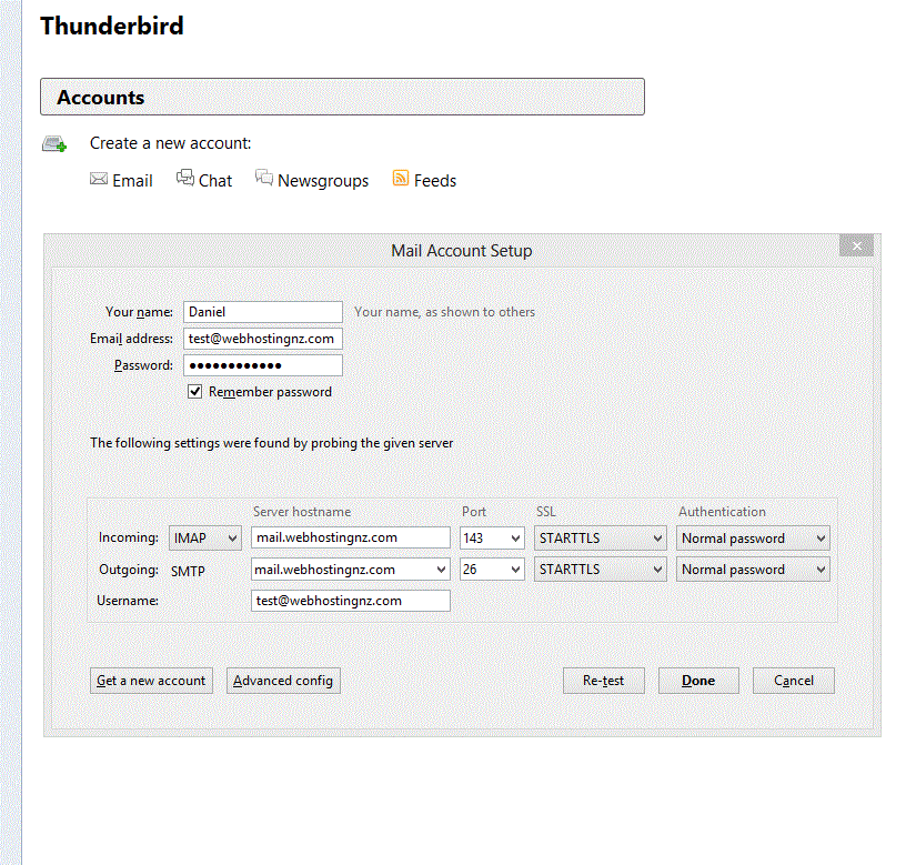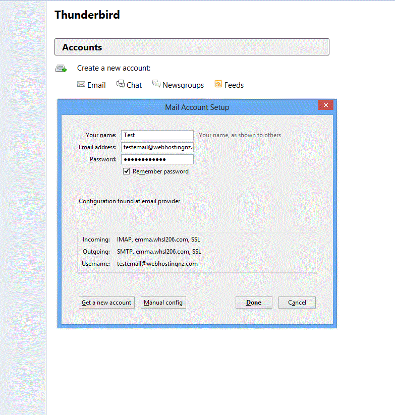 3) Thunderbird will guess settings to work with your our email servers, and by default uses SSL ports. Some anti virus programs require you to not to use SSL for receiving emails so it may scan the email for virus'. If you wish to use SSL (secure Socket Layer) for sending and receving emails click Done, otherwise Click Manual config. Change the following: